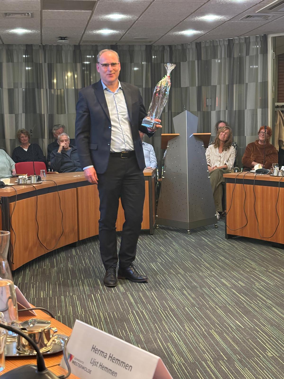 Woensdagavond vond er een raadscommissievergadering plaats. Naast de verschillende besproken onderwerpen (die door tijdsgebrek niet allemaal aan bod kwamen), was er gelukkig nog aandacht voor het feit dat onze gemeentesecretaris, Harby Scheper, alvast afscheid nam van de gemeenteraad. Harby gaat met vervroegd pensioen en als college verliezen we een zeer ervaren secretaris. Het afscheid van het college zal op een later moment plaatsvinden. De voorzitter van de raadscommissie overhandigde Harby, namens de gemeenteraad, een mooi cadeau.