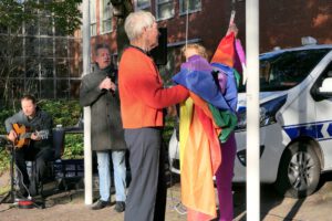 Vrijdag was het 11 oktober en dan wordt Coming Out Day gevierd. Zo ook in Westerwolde. We hesen de vlag onder de klanken van het Westerwolds volkslied ‘Ik ken een schoon en lieflijk land’ wat door Klaas Spekken prachtig is vertaald in het Gronings.